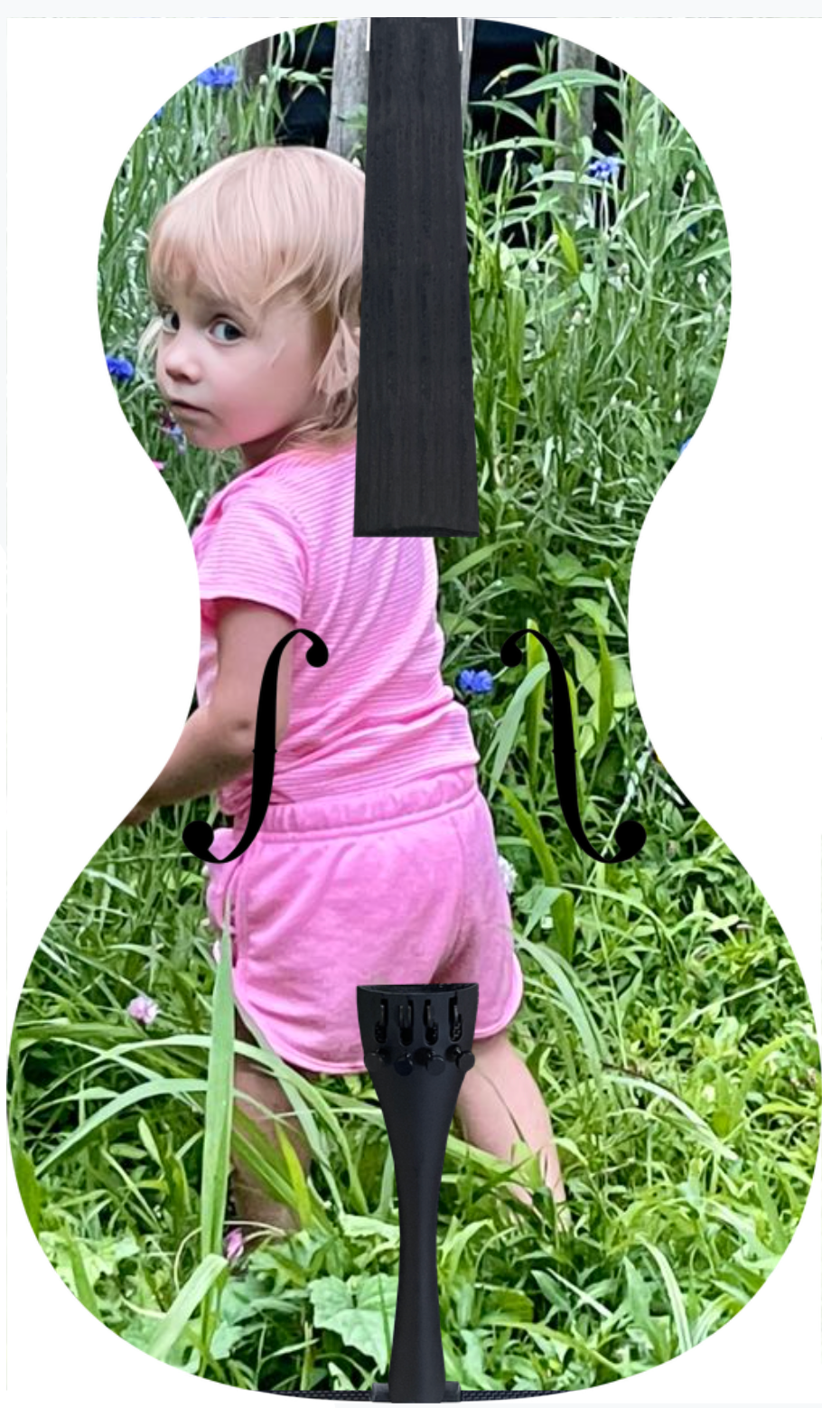 Our Forte3D® Cello custom printed with YOUR OWN PERSONALIZED DESIGN. If you We can UV paint our Carbon Fiber Cellos in a way that doesn't affect the sound. The rest of the cello is black like the original version. PLEASE email us if you'd like to customize BOTH the top AND the back.